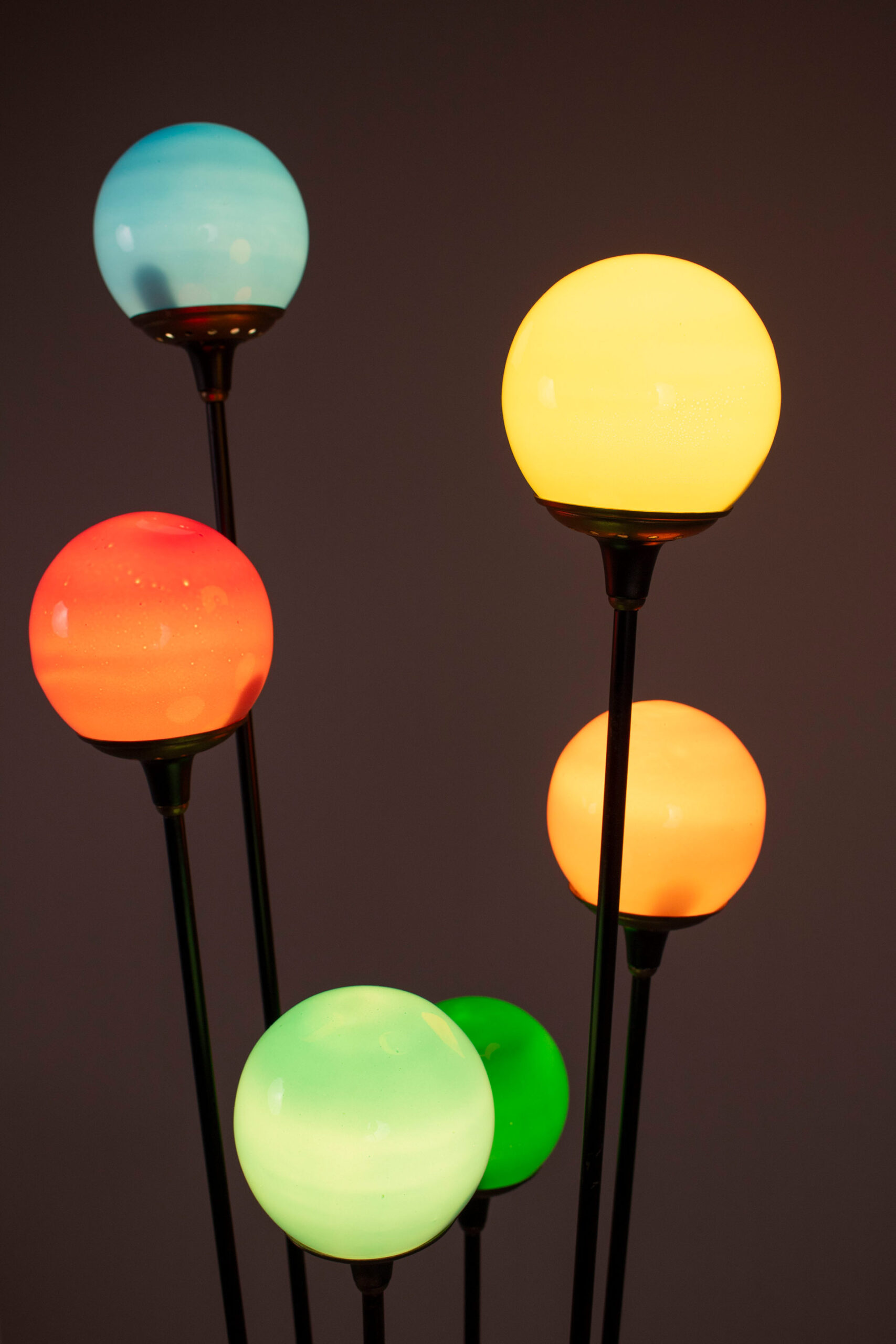 Aus Messing, schwarzen Eisenrohren, Marmor und farbigem Glas (Grün, Blau, Türkis, Rot, Orange, Gelb). Guter gebrauchter Zustand, schöne Patina, funktionstüchtig. Das Kabel ist im Originalzustand.