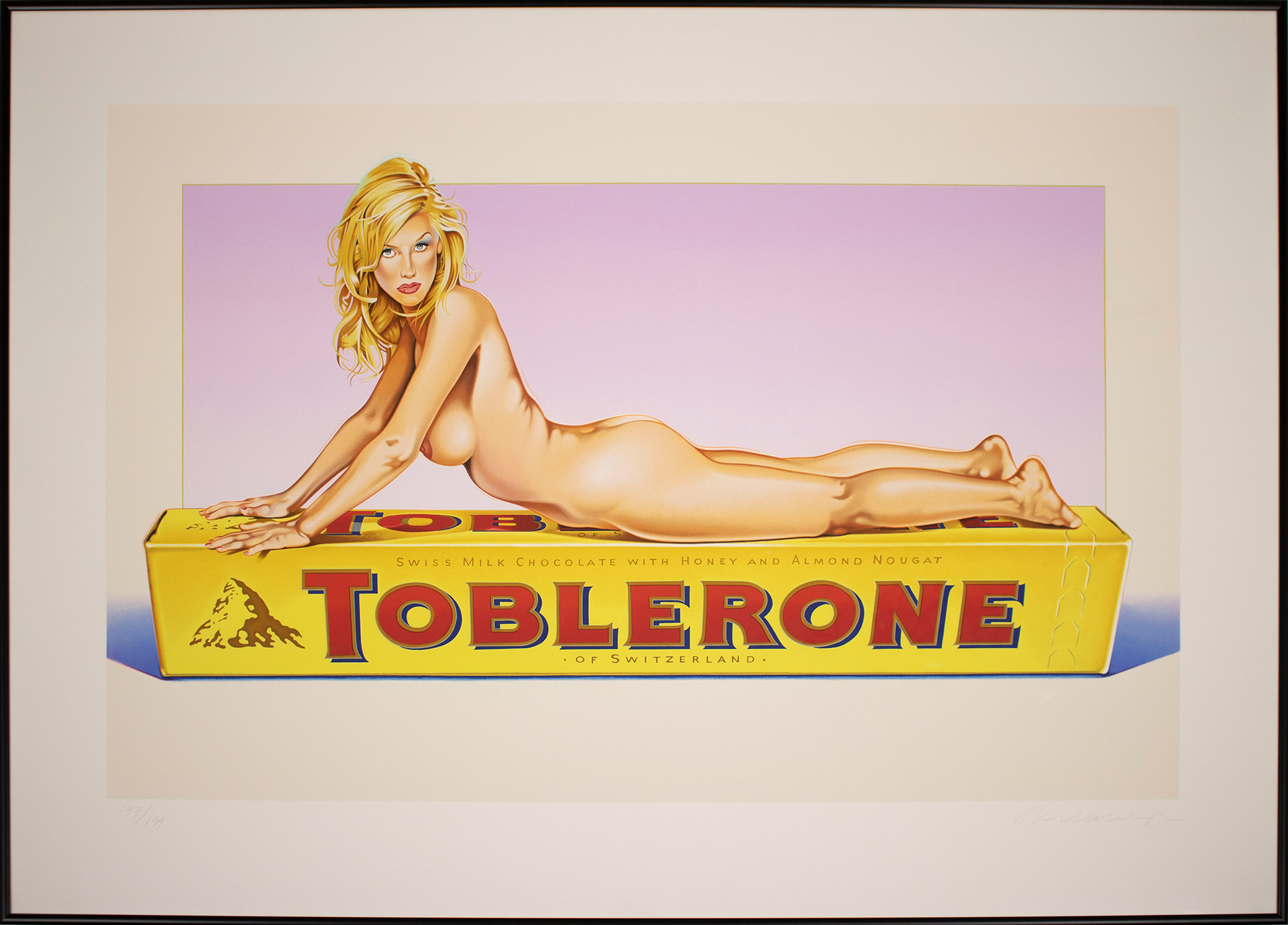 Mel Ramos, geboren 1935 in Sacramento, Kalifornien, gestorben 2018 in Oakland, Kalifornien. Siebdruck in Farbe auf Velin. Rechts unten handsigniert, links unten handgeschriebene Auflage 197 / 199. Auflage von 199 nummerierten Exemplaren, hier Nr. 197. Gedruckt von Carini / S. Giovanni Valdarno mit dem Trockenstempel „C“, herausgegeben von Galerie Ernst Hilger / Wien. Neuer Metallrahmen in Schwarz, verglast